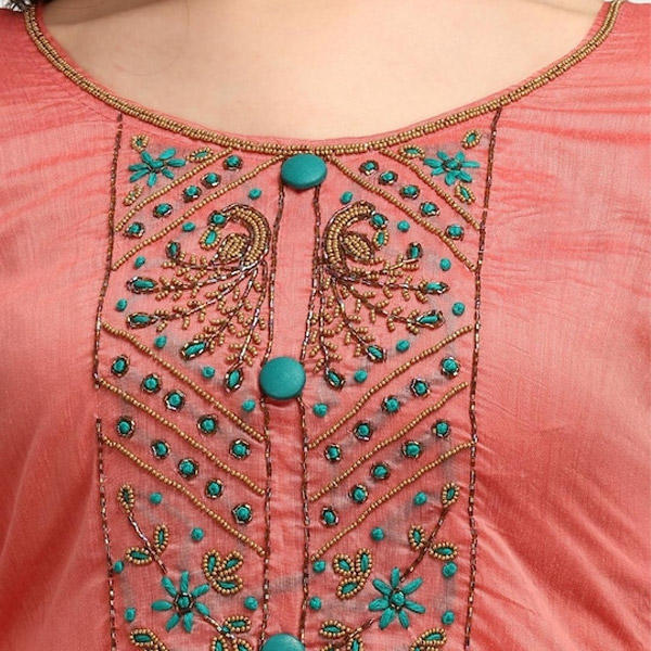 • Peach-coloured and teal green embroidered kurta fabric